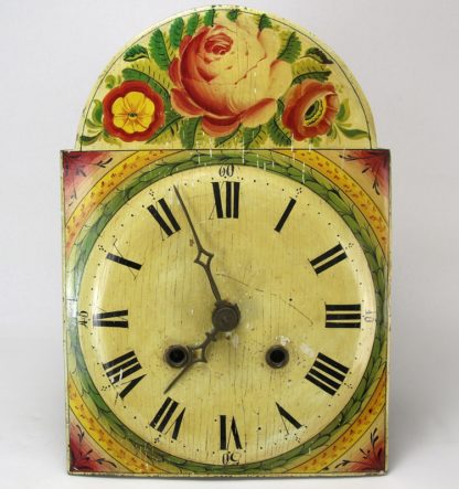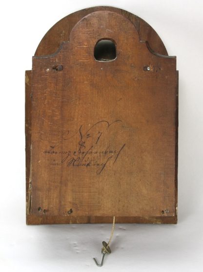 19. Jh. Holzgespindeltes Werk mit Hinterpendel (fehlt) und Schlag zur halben und vollen Stunde auf Glocke. Ein Gewicht beiliegend. Größe ca. 25 x 18 cm, Höhe ca. 37 cm, Gewicht ca. 4,4 Kilogramm. Nicht geprüft.