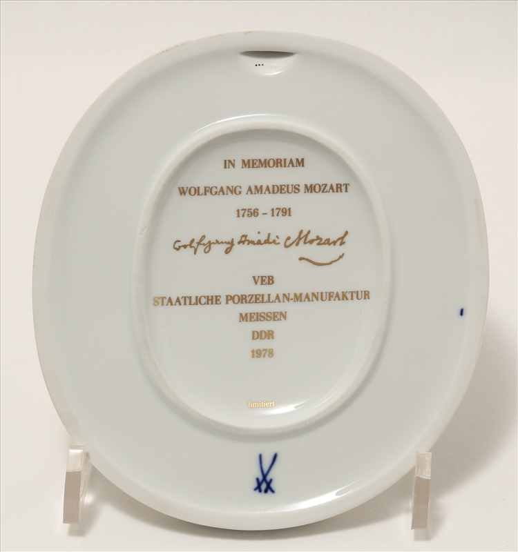 20. Jh. Diverse Gedenkplatten mit Reliefdekor. Meist Biskuitporzellan. U.a. große Ovalplatte mit dem Portrait von W.A. Mozart zum Gedenken. Größe ca. 16,5 x 14,5 cm in Originalkarton. Diverse Schwertermarken. Guter Zustand.