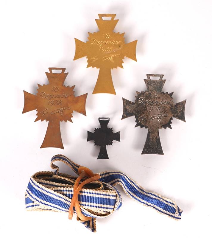 Drei Mutterkreuze und einer Miniatur. Bronze, Silber und Gold. Mit verschiedenen Bändern.