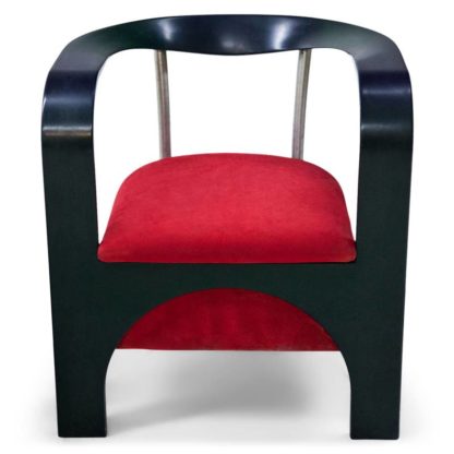 Italien 1980er Jahre. Paar Armstühle von Giugario Design mit dunkelgrünen Arm- bzw. Rücklehnen und Metallbeinen hinten. Die Sitzflächen sind dick gepolstert und wurden neu mit einem hochwertigen Stoff in rot und blau bezogen. Auf der Unterseite gemarkt Cinova, Giugario Design. Größe ca. 69 x 48 cm, Höhe ca. 75, Sitzhöhe ca. 45 cm. Teils Gebrauchsspuren.