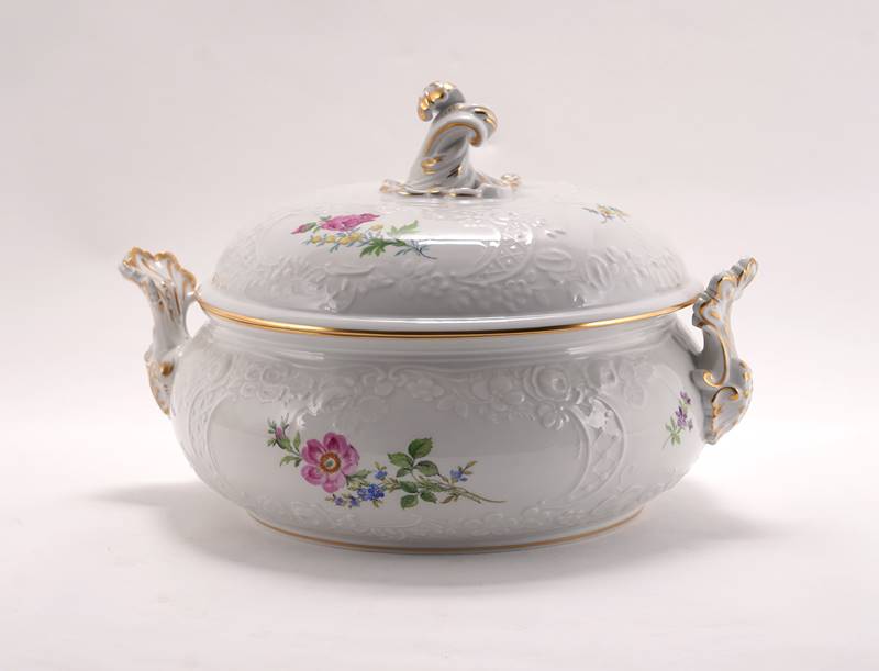 Porzellanmanufaktur Meissen 20. Jh. Große, runde Deckelterrine. Blumendekor mit Neumarseille Relief und Goldstaffage. Unter dem Boden unterglasurblaue Schwertermarke mit Formnummer sowie Malermarke. Größe ca. 29,5 x 25 cm. Höhe ca. 20,5 cm.
