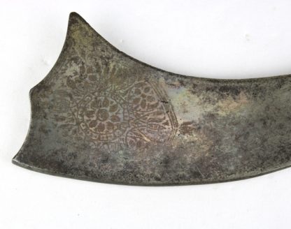 19. Jh. Breite Stahlklinge, vorne beidseitig mit Ätzverzierung. Mit Stoff umwickelter Holzgriff und Messingschützer. Länge ca. 68 cm, Gewicht ca. 1 Kilogramm.