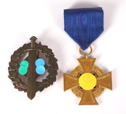 Zwei Abzeichen WK II SA Sportabzeichen, Hersteller L. Chr. Lauer mit Trägernummer 66823 in Bronze, Größe ca. 4,4 x 5,7 cm, Gewicht ca. 16,8 Gramm. 40 Jahre Treuedienst für 40 Dienstjahre, vergoldet, Größe ca. 4,1 x 4,1 cm.