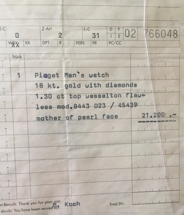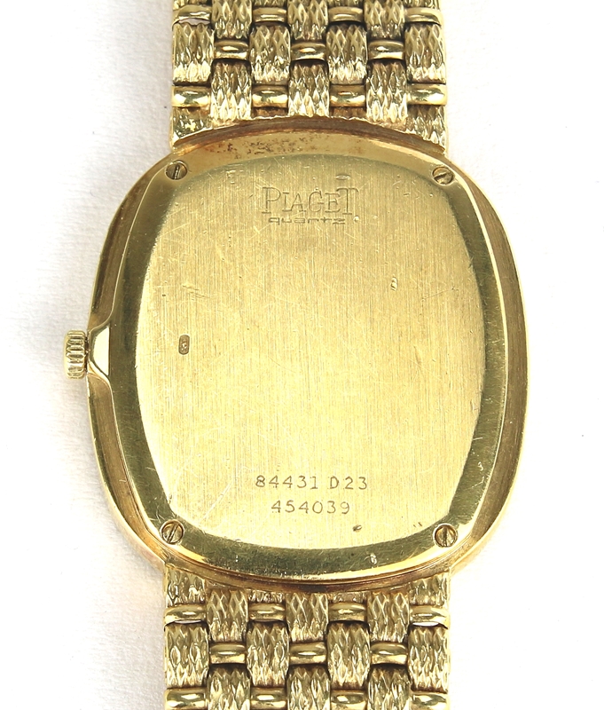 Unisex Goldarmbanduhr (wurde 1987 bei Bucherer in Zürich als Herrenuhr verkauft). Quarzwerk. GG 750 mit 1,3 Carat Diamanten, top wesselton, flawless und Perlmuttzifferblatt. Länge ca. 18 cm, (zwei Zusatzglieder (zusammen ca. 1 cm) liegen bei. Größe Uhr ca. 3,3 x 3 cm. Die Uhr wurde geöffnet und die Batterie wurde ersetzt (nur wieder verschraubt, nicht auf Dichtigkeit geprüft), läuft wieder. Gewicht komplett mit den beiden Gliedern ca. 89,8 Gramm. Kaufquittung in Kopie dabei.
