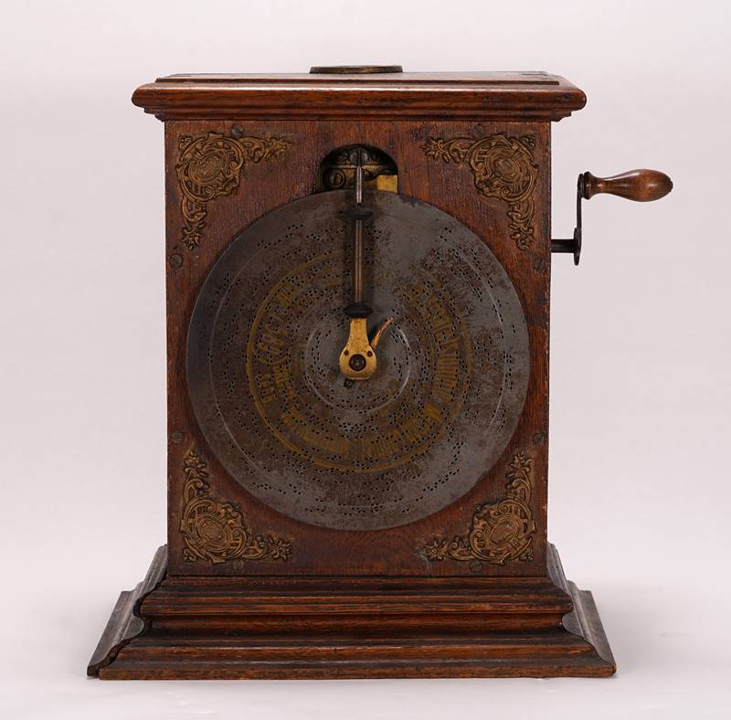 Historismus Polyphon Deutsch um 1900. Holzkorpus mit Metallapplikationen, seitliche Kurbelöffnung mit abnehmbarer Kurbel und oben mit Münzeinwurf. Dazu ca. 17 Lochplatten, eine weitere im Gerät. Größe ca. 29 x 19,5 cm, Höhe ca. 34 cm, Gewicht ca. 7,1 kg. Funktioniert nicht. Eine Sockelleiste ist lose, teils best.
