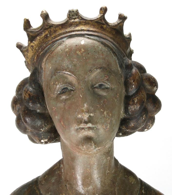 Schwäbisch um 1480. Stehende weibliche Heiligenfigur mit einem Buch in der rechten Hand. Holz, halbrund geschnitzt, polychrom gefasst. Größe ca. 27 x 17 cm, Höhe, ca. 94,5. Farbverlust an der ganzen Figur, am Kopfschmuck sind einige Spitzen abgebrochen. Siehe auch Kunsthaus Heinrich Hahn, Frankfurt, Katalog Nummer 50, Losnummer 157, Tafel 6.