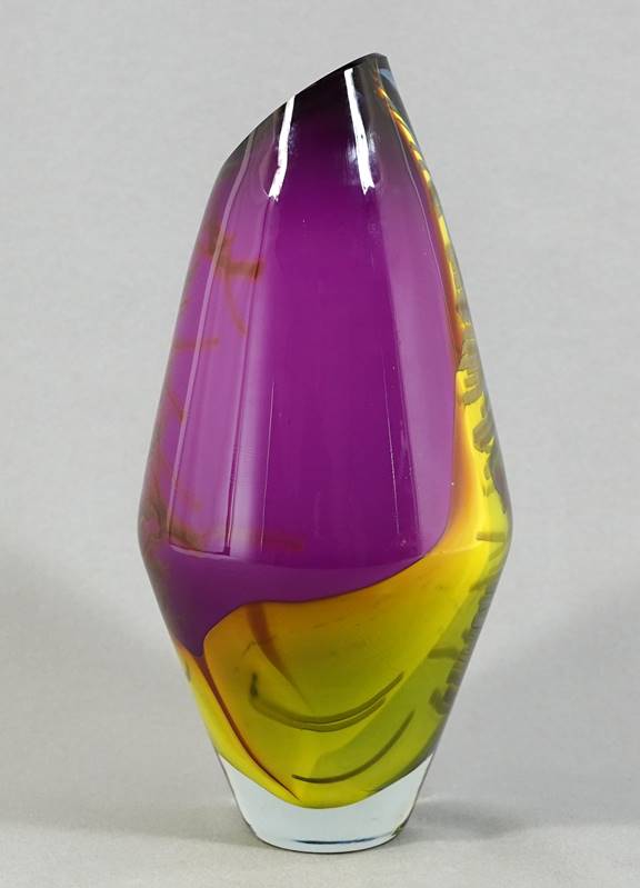 * 1956 USA. Für Union Street Glass. Vase. Ovoide Form, farbloses Glas mit farbigen Einschmelzungen in Grün-, Blau-, Rot- und Gelbtönen. Zwischenlage teilweise opak unterfangen. Unten am Rand signiert und datiert (1982). Durchmesser ca. 14 cm, Höhe ca. 29 cm. Gewicht ca. 2,1 kg.