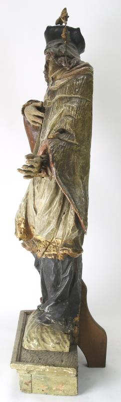 Süddeutsch, 18. Jahrhundert. Heiligenfigur mit ausdrucksstark gearbeiteten Mantel und Sternenkranz. Holz, halbrund geschnitzt und polychrom gefasst. Größe ca. 35 x 19 cm, Höhe ca. 69 cm. Farbverlust, einige Finger sind abgebrochen, leichter Riss im unteren Bereich des Gewandes.