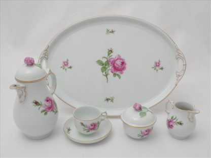 20. Jh. Porzellan mit polychromer Blütenbemalung. Barockstil. 21-teilig komplett für sechs Personen. Unter dem Boden unterglasurblaue Manufakturmarke etc. 38 x 26 cm. Größe Tablett ca. 37,5 x 26,5 cm. Guter Zustand, keine Chips.