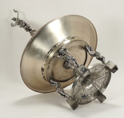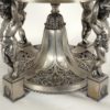 Tafelaufsatz 19. Jh. Metall. Eine große Schale auf einem Ring getragen von vier Putti. Oben auf eine Art Siegesgöttin mit je einem Siegerkranz in der Hand. Durchmesser ca. 36 cm, Höhe ca. 60 cm, Gewicht ca. 2,87 kg. Rand teils verbogen, teils berieben.