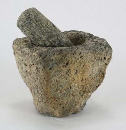 Kleiner Steinmörser mit Pistill Wohl antik. Stein. Roh behauen. Durchmesser des Mörsers ca. 20 cm, Höhe ca. 14 cm, Gewicht ca. 4 kg. Länge des Pistills ca. 14,5 cm, Gewicht ca. 1 kg. Altersbedingter Zustand.
