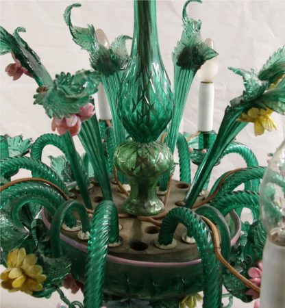 19./20. Jh. Fünfflammig, später elektrifiziert und weitere Leuchterausleger mit Tüllen für Kerzen. Polychromes Glas mit sehr schönen floralen Applikationen. Durchmesser ca. 65 cm, Höhe ca. 90 cm, Gewicht ca. 11 Kilogramm. Elektrik nicht geprüft, einige Teile fehlen, zusätzliche Teile wie abgebildet beiliegend.