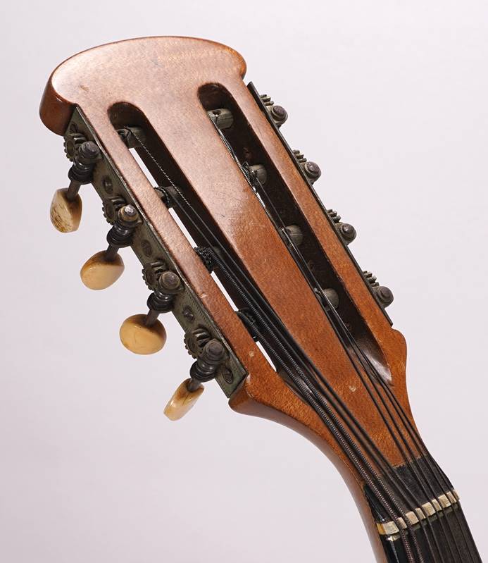 Mandoline Luigi Embergher. Roma, Ende 19. Jh. Jugendstil Mandoline. Schön gearbeitet mit Intarsien aus Perlmutt und Schildpatt. Tragetasche beschädigt. Gesamtlänge ca. 76 cm. Korpus ca. 40 cm. Steg ca. 34 cm. Zustand wie abgebildet.