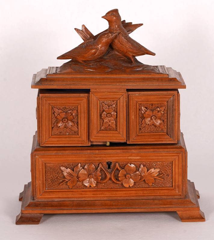 Schmuckkästchen Wohl Brienz 20. Jh. Holz geschnitzt. Ausladendes Postament auf vier Füßen. Darüber zweiteiliger Aufbau mit aufklappbarem Deckel. Darauf zwei Vögelchen. Größe ca. 17 x 10 cm, Höhe ca. 19 cm. Minimal bestoßen. Schlüssel anbei.