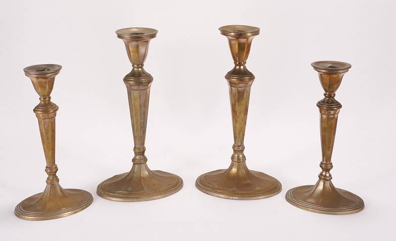 4 Art Deco Kerzenleuchter Um 1900. Goldfarbener Metallguss. 4 einflammige Kerzenleuchter auf ovalem Fuß in zwei Größen. Max. Größe ca. 15 x 11 cm, Höhe ca. 27 cm. Gesamtgewicht ca. 4,9 kg. Altersbedingter Zustand.