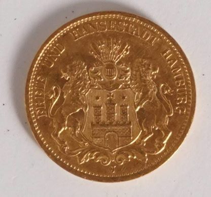 Goldmünze 20 Mark Kaiserreich 1880, Freie und Hansestadt Hamburg, J. Durchmesser ca. 22,6 mm, Gewicht ca. 7,95 Gramm. Zustand wie abgebildet.