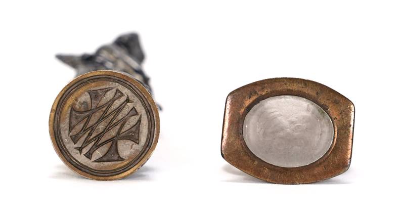 Zwei Petschaften Ein kleiner Metallamor mit dem Wappen WM unter dem Boden und ein Metallanhänger mit zwei Füllhörnern und einer Gemme mit Männerprofil im Fuß. Durchmesser des Amors ca. 2,5 cm, Höhe ca. 9 cm.