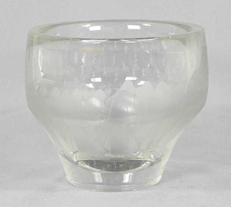 Lackovic, Ivan 1932 Batinska - 2004 Zagreb. Kroatischer Naiver Künstler. Vase. Lampenträgerinnen, 1993. Wandung mit graviertem Dekor. Prozession von schreitenden Landfrauen mit Laternen. Unten am Stand signiert und datiert Ivan Lackovic Croata (19)93. Verkäuferetikett am oberen Rand Samobor Kristal, Made in Croatia. Durchmesser ca. 22 cm, Höhe ca. 19 cm. Gewicht ca. 7,8 kg. Oben am Rand ein kleinster Chip, unter dem Boden leichte Standspuren. Siehe Ivan Lackovic Croata, Vita Arte, Genève 1983, S.31 Lampenträgerinnen (1977).