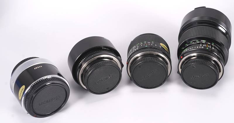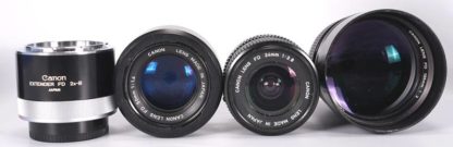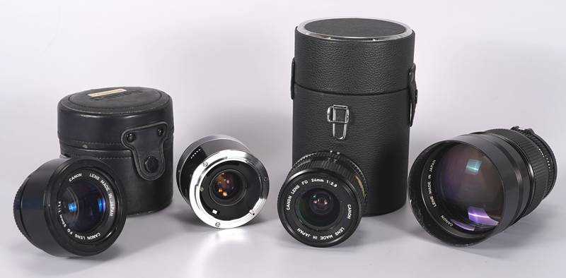 Drei Objektive: 1 x FD 50mm 1:1,4, 1 x FD 24mm 1:2,8, 1 x FD 135mm 1:2. Dazu ein Extender FD 2x-B. Teils in Schatullen. Funktion nicht geprüft, bitte selbst besichtigen.