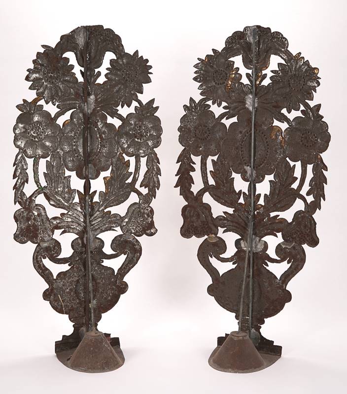 Paar Blaker Wohl deutsch 19. Jh. Metallblech, getrieben mit Resten alter, polychromer Fassung. Zwei Standblaker in Form von einer Vase mit Blumenbouquet. Größe je ca. 25 x 11 cm, Höhe je ca. 56 cm. Gesamtgewicht ca. 1300 Gramm. Altersbedingter Zustand wie abgebildet.