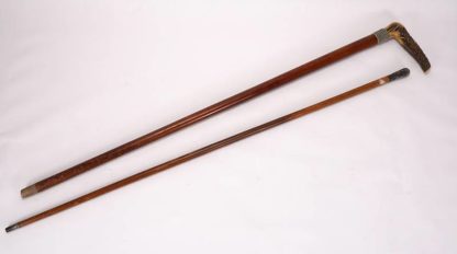 Zwei Spazierstöcke 20. Jh. Zwei Holzstöcke, einmal mit Horngriff mit Metallmontur, einmal mit Silbermontur, ungedeutete Silberpunze. Länge ca. 88 cm.