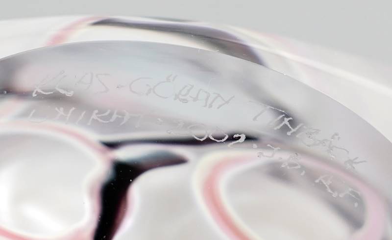 * 1951, Schweden, lebt und arbeitet in Valla. Vase, 2002. Dickwandiges, farbloses Glas mit weißem Unterfang und Einschmelzungen. Unter dem Boden signiert und bezeichnet UNIKAT 2002 J.B. R.F. (Jan Beijer und Ronny Fagerberg). Größe ca. 12 x 12 cm, Höhe ca. 30 cm, Gewicht ca. 4,8 kg. Teils kleine, wohl produktionsbedingte, Fehlstellen. Unter dem Boden entlang des Randes kleinste Chips. Bitte besichtigen sie selbst.