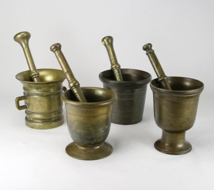 Konvolut Mörser mit Pistill Bronze. Vier Mörser, verschieden gestaltet, teils mit Griffen, jeweils mit Pistill. Maximaler Durchmesser ca. 14 cm, Höhe ca. 12 cm. Maximale Länge des Pistills ca. 22 cm, Gesamtgewicht ca. 14,3 kg.