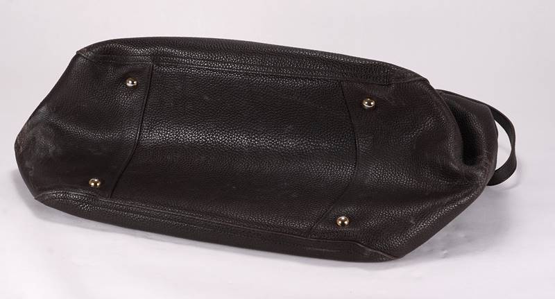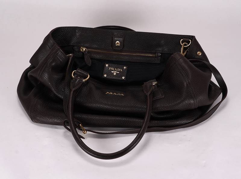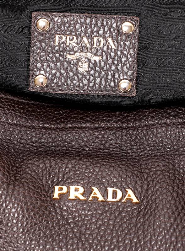 Prada Handtasche Mailand 20. Jh. Dunkelbraune, genarbtes Leder mit goldfarbenen Metallelementen. Großer, längsrechteckiger Shopper mit Doppelhenkel und abnehmbarem Schultergurt. Zwei Innenfächer. Verschluss durch einen Druckknopf. Schutzfüße. Pradaemblem auf der Außenseite der Tasche sowie goldfarbene Prägung innen und auf einigen Metallelementen. Größe ca. 38,5 x 21 cm, Höhe ca. 27 cm. Starke Gebrauchsspuren.