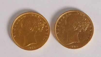Zwei Goldmünzen England 1852/1884. Je Sovereign, Victoria, verso Wappen. Durchmesser je ca. 22 mm, Gewicht ca. 7,96/7,98 Gramm. Zustand wie abgebildet.