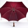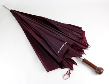 Porsche Regenschirm Deutsch 20. Jh. Regenschirm aus dunkelrotem Stoff mit Holzknauf in eleganter, schmaler Stoffhülle. Auf dem Rand des Schirmes weißer gestickter Schriftzug Porsche und Porschelogo auf dem Knauf. Länge ca. 83 cm.