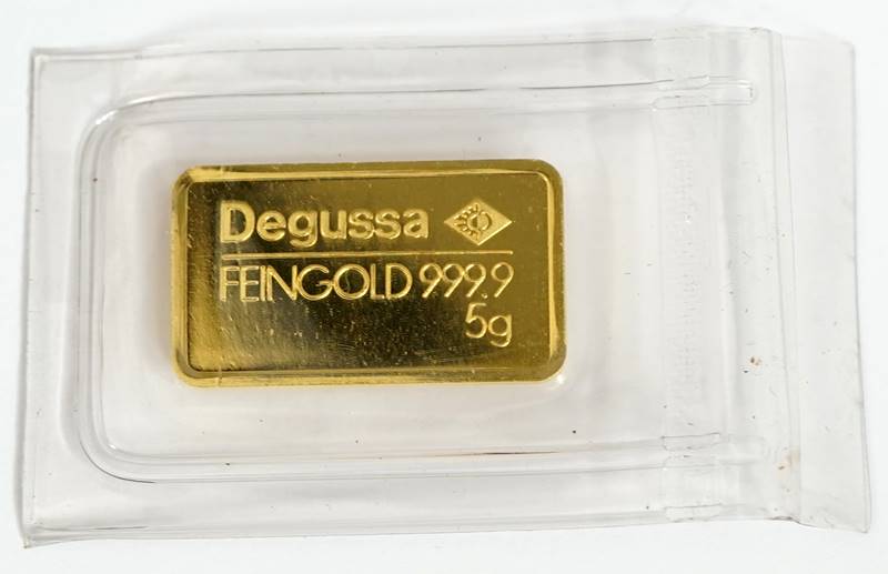 Degussa Barren Feingold 999,9, 5 g. Im Blister.