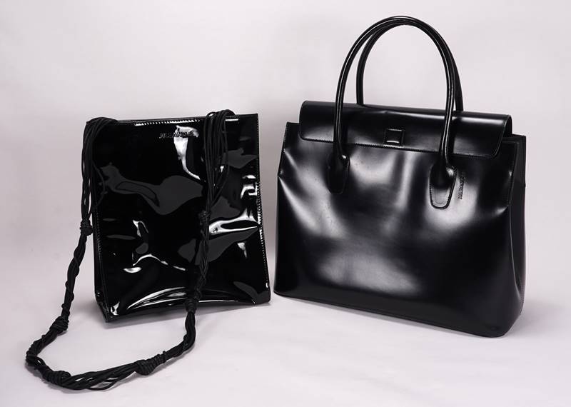 Konvolut Jil Sander 4 verschiedene Taschen, meist Leder. Schwarz, hellbraun, dunkelblau und schwarzlack. Jeweils mit Bezeichnung. Maximale Größe ca. 35 x 15 cm, Höhe ca. 28 cm. Zustand wie abgebildet. Anbei zwei Staubbeutel.