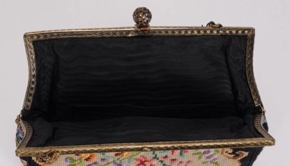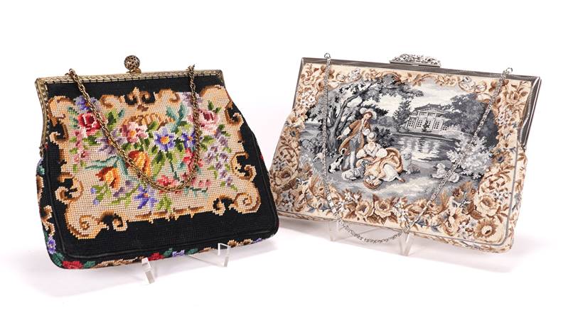 Zwei Abendtäschchen Wien 20. Jh. Gobelin und Metallmontur. Wohl J. Jolles Studios Wien. Maximale Größe ca. 16 x 23 cm.