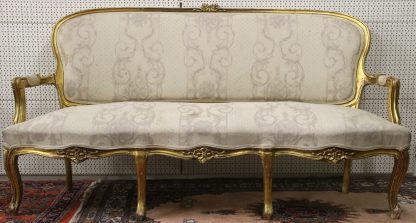 Frankreich um 1900. Holz, teils geschnitzt und goldstaffiert. Größe ca. 172 x 65 cm, Höhe ca. 93 cm. Unrestaurierter Originalzustand wie abgebildet, eine Armlehne komplett ausgebrochen.