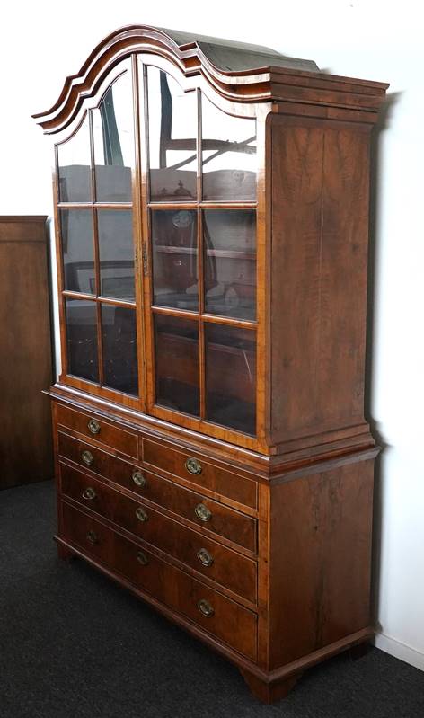Frankreich frühes 19. Jh. Nussbaum furniert. Breiter, sechsschubiger Unterbau mit zweitürigem Vitrinenaufsatz mit getrepptem, überkragenden Giebel. Schubladen mit schönen reliefierten Messingbeschlägen. Größe ca. 164 x 53 cm, Höhe ca. 235 cm. Altersbedingter Zustand, teils best. Schlüssel anbei.