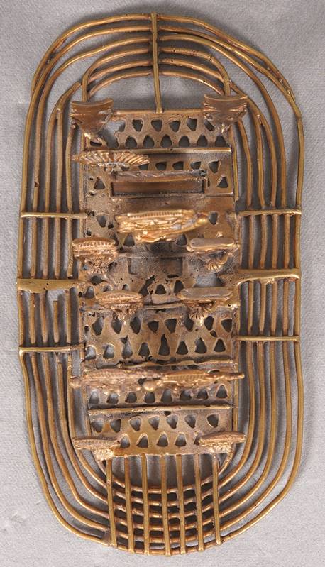 Metall. Replik des Goldartefakts der legendären Stadt/Land Eldorado. Es gibt die Zeremonie auf dem See Guatavita wieder, die bei Amtsantritt des neuen Herrschers der Muisca abgehalten wurde. Das Original aus Gold befindet sich im Museo del Oro der Banco de la República in Bogotá und wurde 1969 in einer Höhle südwestlich der alten Muisca-Siedlung Pasca gefunden. Größe ca. 9 x 18 cm, Höhe ca. 5,2 cm, Gewicht ca. 200 Gramm. Zustand wie abgebildet.