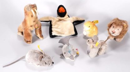 Konvolut Steiff Tiere Meist 1950er-1970er Jahre. Insgesamt sieben Tiere. Ein Walross "Paddy", ein Delphin "Clippy", ein Pudel "Snobby", ein Häschen Nr. 7144/03, eine Maus "Fiep", ein Löwe und eine Pinguin-Handpuppe. Größe des Walrosses ca. 10 x 15 cm, Höhe ca. 17 cm. Zustand wie abgebildet. Bitte selbst besichtigen.
