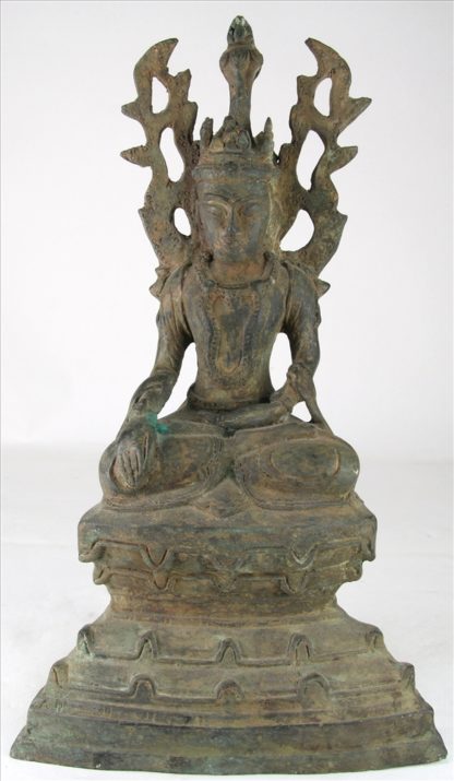 Himalaya, wohl 19. Jhdt., Sitzende Tara auf Lotusthron in der Geste der Erdanrufung, Bronze, innen befüllt, Größe ca. 19,5 x 10,5 cm. Höhe ca. 33 cm. Gewicht ca. 3 Kilogramm. Altersbedingte Gebrauchsspuren.