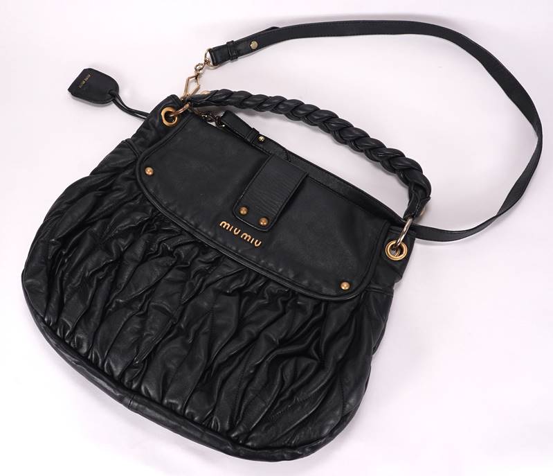 miu miu Umhängetasche Vintage Tasche, 20. Jh. Gerafftes Leder und Metallbeschläge. Aufgesetztes Branding und Presslogo am Verschluss. Innentasche ebenfalls mit Logo. Größe ca. 31 x 38 cm. Beiliegende Beschreibung. Gebrauchter Zustand mit Patina.