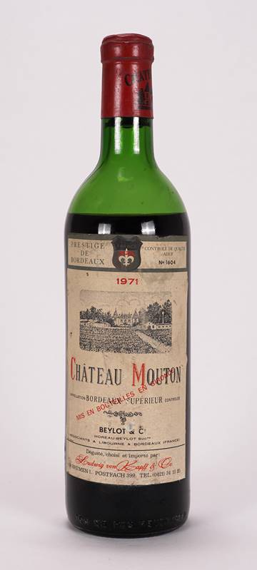 1 Flasche Chateau Mouton Bordeaux supérieur 1971. Beylot&Co. Oben nummeriert 1604. Füllstand Anfang Schulter. Aus privatem Weinkeller.