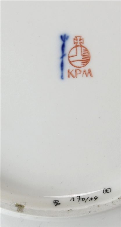 KPM Berlin 20. Jh. Porzellan polychrom staffiert. Durchbrochen gearbeiteter Rand und Blumenbuket mit Schmetterling. Goldstaffierter Rand. Unter dem Boden Zeptermarke und Reichsapfelmarke sowie Malermarken. Größe ca. 19,5 cm, Höhe ca. 4 cm. Guter Zustand.