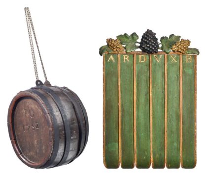 Deutsch 18./19. Jh. und 1932. Eiche und Eisen bzw. Holz, geschnitzt und polychrom gefasst. Zierfass mit Aufhängung, 1932 datiert und bezeichnet «FU». Fassplatte, bekrönt von roten und weißen Trauben sowie Weinblättern, bezeichnet «A.R.D.V.X.B.». Größe des Fass ca. 23 x 11 cm, Größe der Platte ca. 49 x 34,5 cm. Provenienz: Privatsammlung Markgräflerland. Guter, teils altersbedingter Zustand. Fassreifen stellenweise gelockert. Partiell leichte Farbfehlstellen und unten rechts kleine Holzfehlstelle (ca. 1,5 cm) an der Platte, verso wohl ehemalige Schildhalterung ausgebrochen.