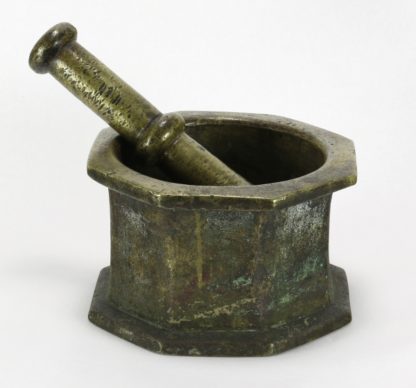Mörser mit Pistill Spanien 18./19. Jh. Bronze. Kapitaler achteckiger Mörser. Durchmesser des Mörsers ca. 21,5 cm, Höhe ca. 12,5 cm, Gewicht ca. 10 kg. Länge des Pistills ca. 25 cm, Gewicht ca. 3 kg. Altersbedingter Zustand.