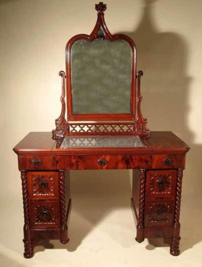 19. Jh. Mahagoni furniert. Schöner, eleganter Damenschreibtisch mit neogotischen Ornamenten im restaurierten Zustand. Größe ca. 115 x 55,5 cm, Höhe ca. 178 cm, Tischplattenhöhe ca. 80 cm. Höfische Provenienz. Furnier teils berieben.