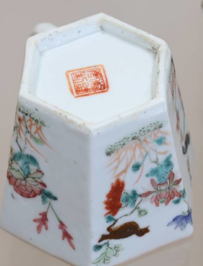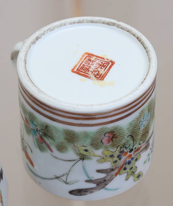 China Qing-Dynastie. Famille verte und rose Malerei, einmal mit Schmetterlingen, einmal mit Vögeln. Unter dem Boden je wohl Qianlong Marke. Einmal rund, Durchmesser ca. 6,5 cm, Höhe ca. 6 cm, einmal eckig, Durchmesser ca. 8,5 cm, Höhe ca. 7 cm. Teils berieben.