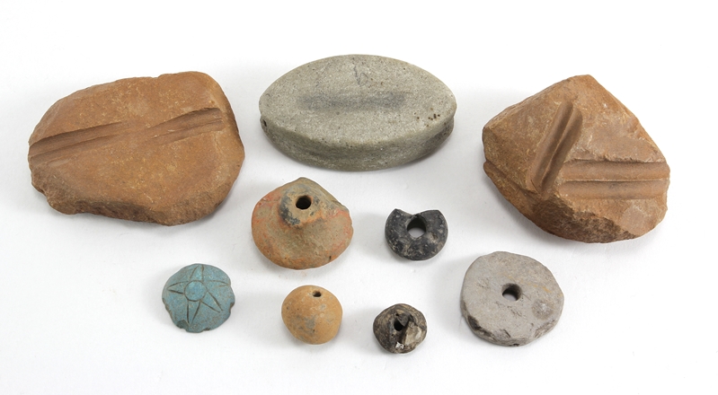 Konvolut Steinwerkzeug Aus einer umfangreichen und mit Sachverstand zusammengestellten Privatsammlung. Neolithikum. Zwei Perlenschleifsteine und weitere Steine zur Schmuckherstellung. Maximale Größe ca. 7 x 5 cm. Gesamtgewicht ca. 800 Gramm.
