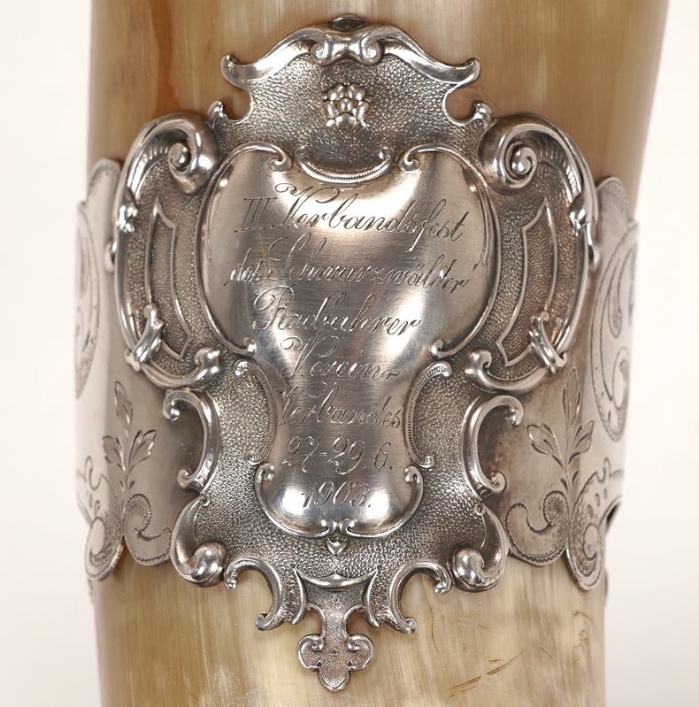 Süddeutsch 1903. In versilbertes Metall gefasstes Horn. Auf Rocaillenfuß stehendes Füllhorn mit Montur und Deckel. Auf dem Deckel Radfahrer mit Siegeskrank sowie Inschrift Ehrenpreis gestiftet von Jos. Grieshaber Söhne, Furtwangen zu dem Rennen des V. Stiftungsfestes des Radf. Ver. Furtwangen 27.-29.6. 1903. Gründung des Vereins 27. März 1898. Größe ca. 40 x 17 cm, Höhe ca. 58 cm. Gewicht ca. 1,64 kg.