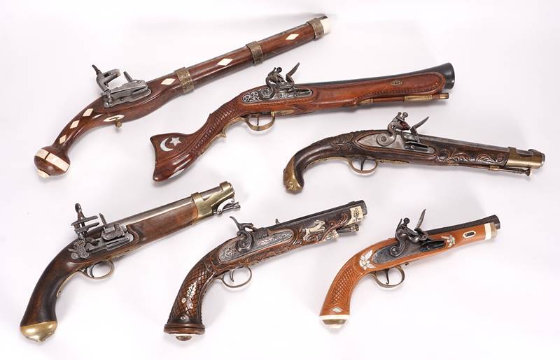 Wohl teils 18. Jh. aus verschiedenen Ländern. Sechs Handfeuerwaffen aus Holz mit Eisenbeschlägen. Mit Steinschloss und teils Ladestock, teils mit Intarsien aus Perlmutt und Bein, teils Holzschnitzereien an Griff und Lauf. Maximale Größe ca. 54 cm. Gesamtgewicht ca. 6,5 kg.