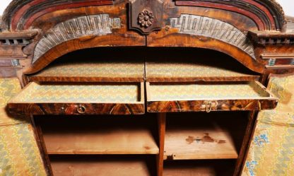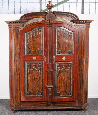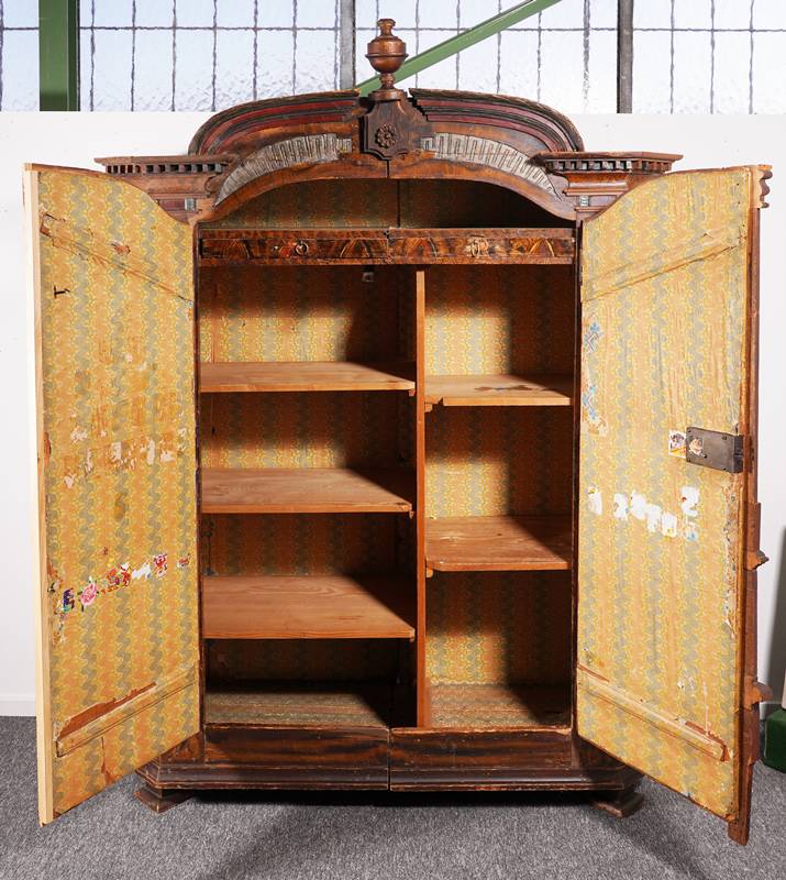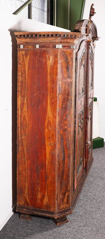 Bodenseegebiet um 1800. Weichholzkorpus, altlasiert auf eckigen Füßen, mit geschrägten Ecken. Profiliertes Gesims mit aufgesetztem Kranz und Vasenbekrönung. In den Türen profilierte, architektonische Applikationen, teils farblich abgesetzt. Wohl originales Schloss und Beschläge. Geteiltes Innenleben mit oben aufgesetztem Schubladenelement. Größe ca. 160 x 53 cm, Höhe ca. 215 cm. Ein Schlüssel anbei. Altersbedingter Zustand wie abgebildet.