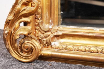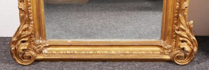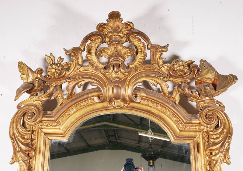 Franken 18. Jh. Teils Holz geschnitzt, teils Stuck auf Holz, teils vergoldet, teils goldstaffiert. Raumhoher Spiegel mit reicher Rocaillen- und Akanthuszier im durchbrochen gearbeiteten Giebel. Links und rechts auch vollrunde Vogeldarstellungen. Größe ca. 240 x 86 cm. Provenienz laut Einlieferer fränkisches Schloss Buttenheim, Gräfin Seyfried. Kein Versand möglich. Gerne empfehlen wir eine Spedition.